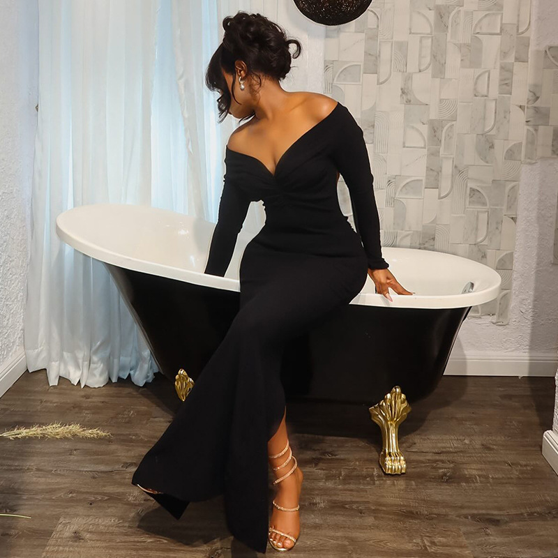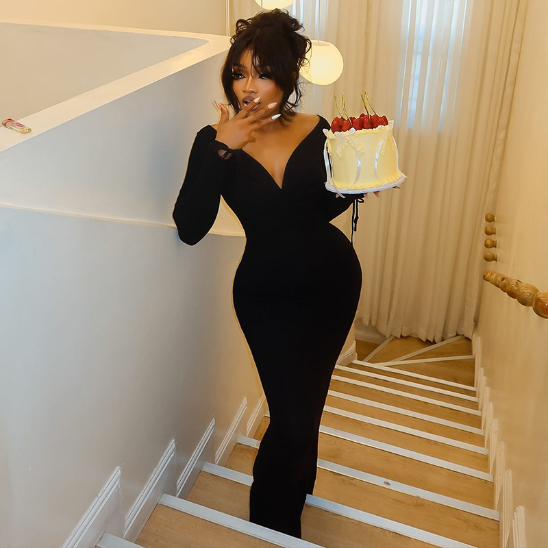 High-slit Backless V-neck Long-sleeved Bodycon Dress