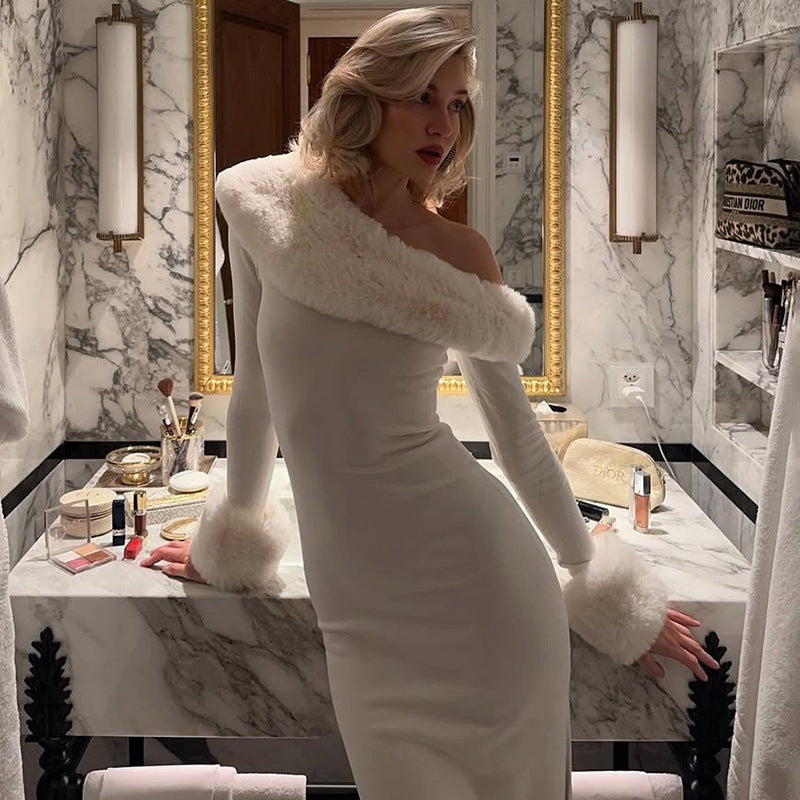 Solid Color Long Sleeve Oblique Collar Slim Christmas Dress