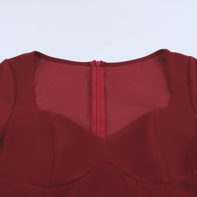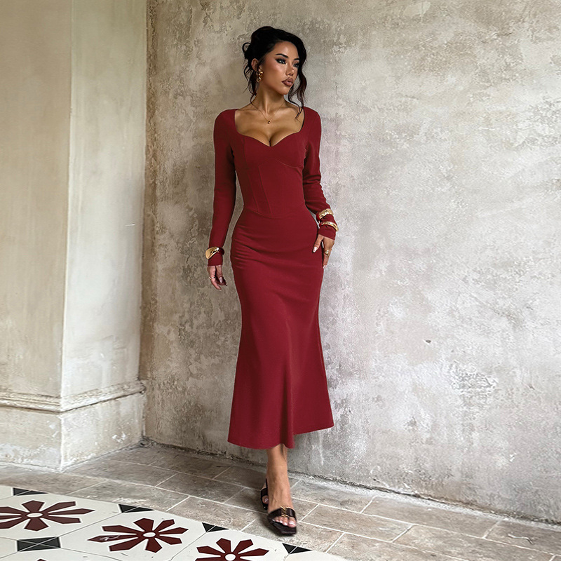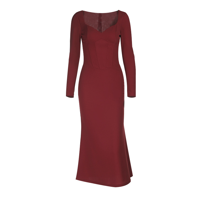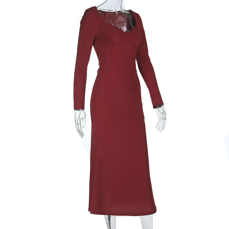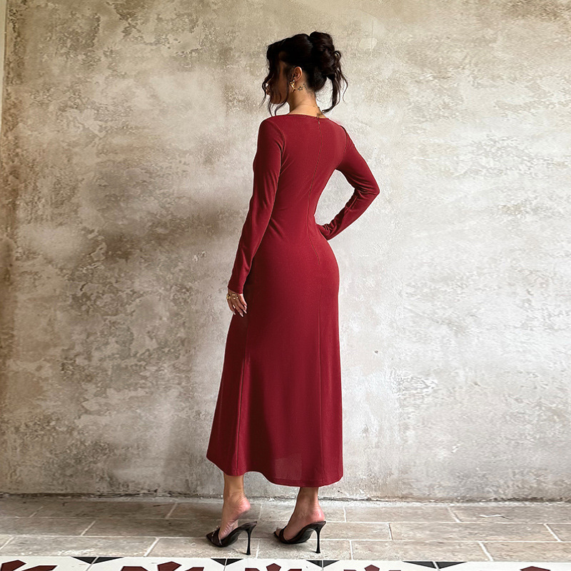 Waist-cinching Long-sleeved Dress Solid Color Slim Fit