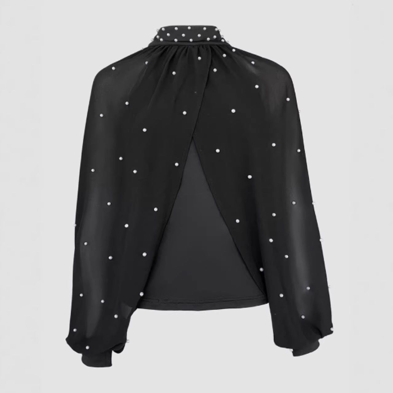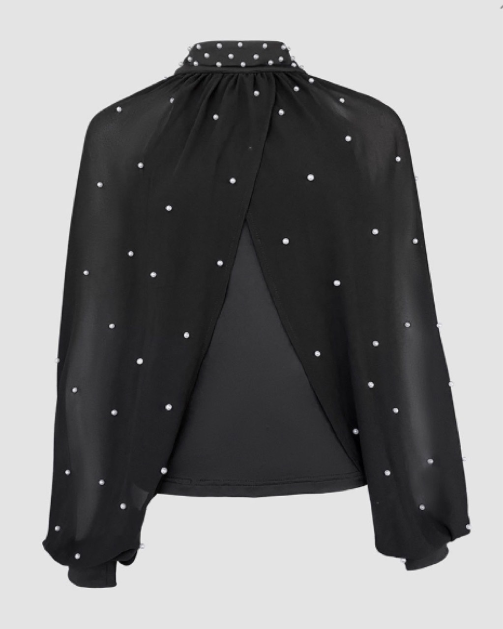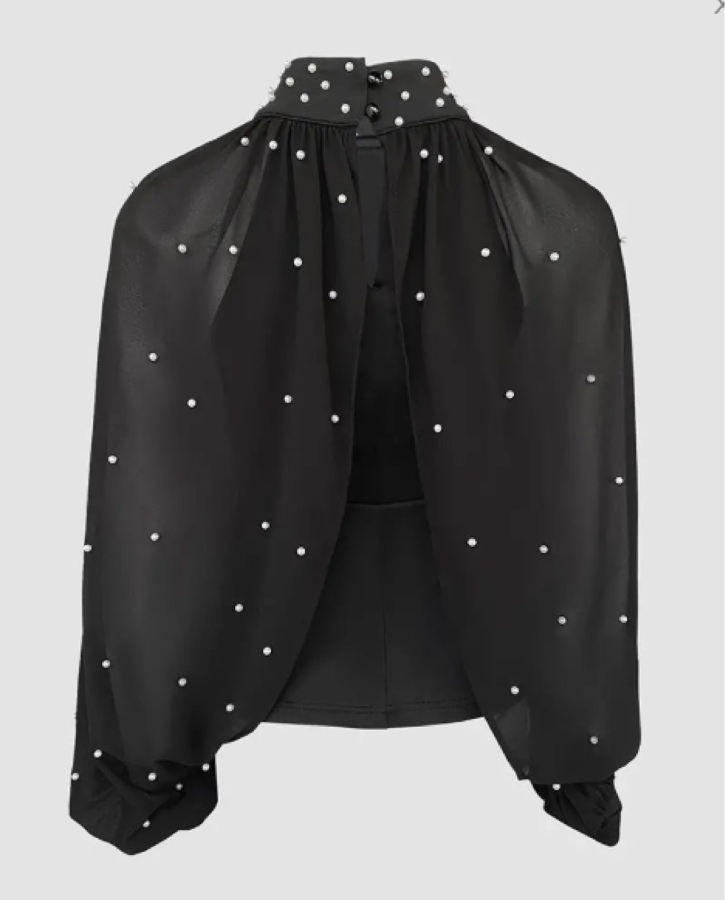 Womens Mesh Long-sleeve Thong Top With Puffed Sleeves And Beaded Detailing